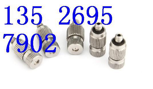 材质可分铜和不锈钢 >0号加湿雾化喷头 孔径0.10mm操作压力10~70kg/cm 喷雾量10~/min >1号加湿雾化喷头 孔径0.15mm操作压力10~70kg/cm 喷雾量20~/min >2号加湿雾化喷头 孔径0.20mm 操作压力10~70kg/cm 喷雾量49~89cc/min >3号加湿雾化喷头 孔径0.30mm 操作压力10~70kg/cm 喷雾量80~145cc/min >4号加湿雾化喷头 孔径0.40mm 操作压力10~70kg/cm 喷雾量95~178cc/min >5号加湿雾化喷头 孔径0.50mm 操作压力10~70kg/cm 喷雾量130~/min >注:本公司雾化喷头孔全是精钻研磨孔,非激光孔请购时注意二者的差别 同时我公司还生产和其配套使用的各种高压管路件,如三通,单喷座,双喷座,直通,弯头,未端堵头等。绝对低价,保证高品质!!欢迎选购13526957902 QQ:1610698986赵女士