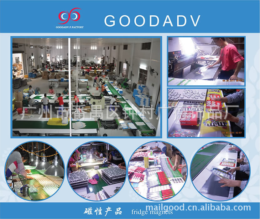 1)磁性冰箱贴:采用下面软胶磁铁+上面铜版纸彩色印刷腹膜制作而成。
