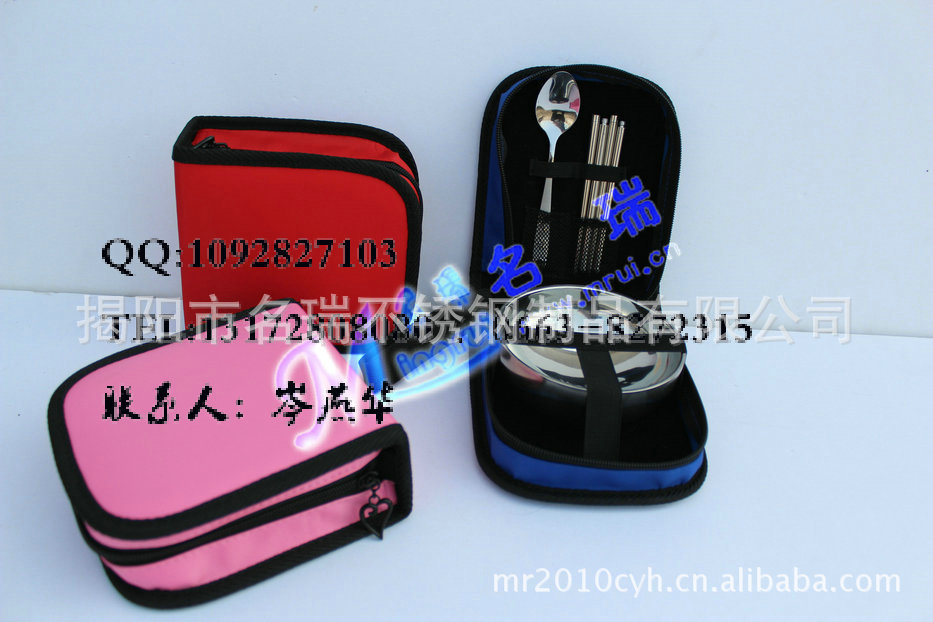 方型布包户外旅行双层隔热不锈钢碗勺折叠筷餐具套装,主要由一个碗一个勺一双折叠筷子装一个方型布包组合而成。产品可以激光雕刻LOGO,具体情况如图所示:【如有不明,可以来电咨询13172808080/0663-8272315岑燕华,QQ:1092827103】