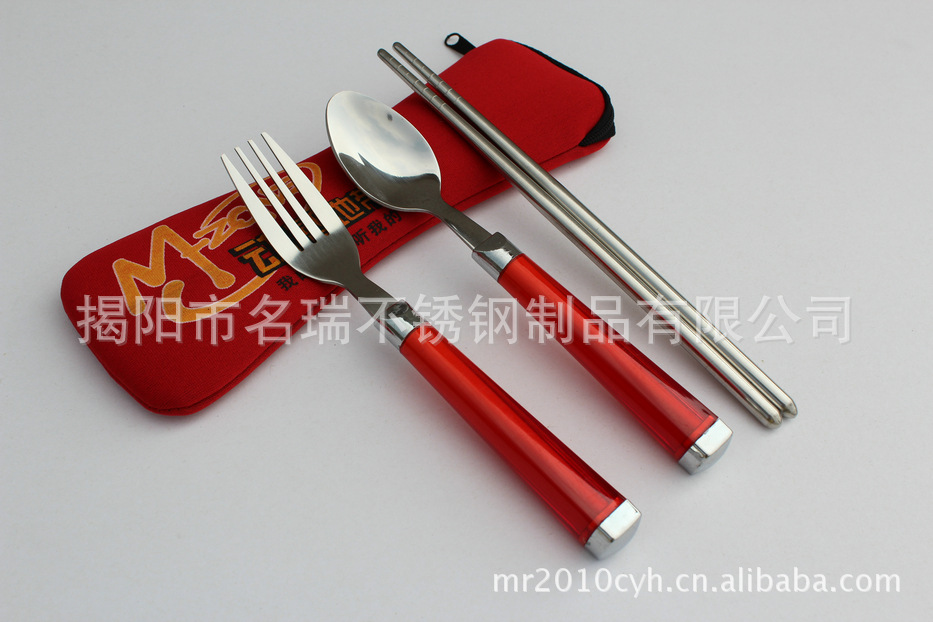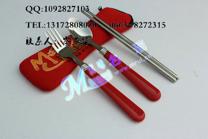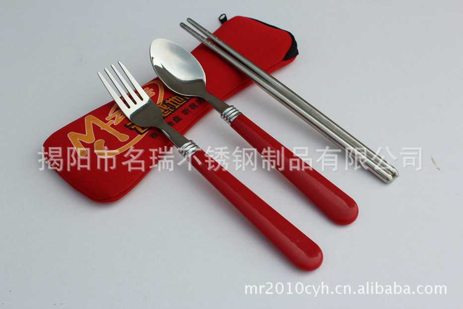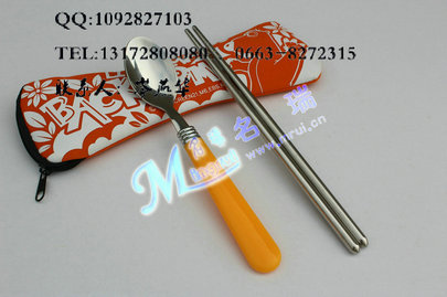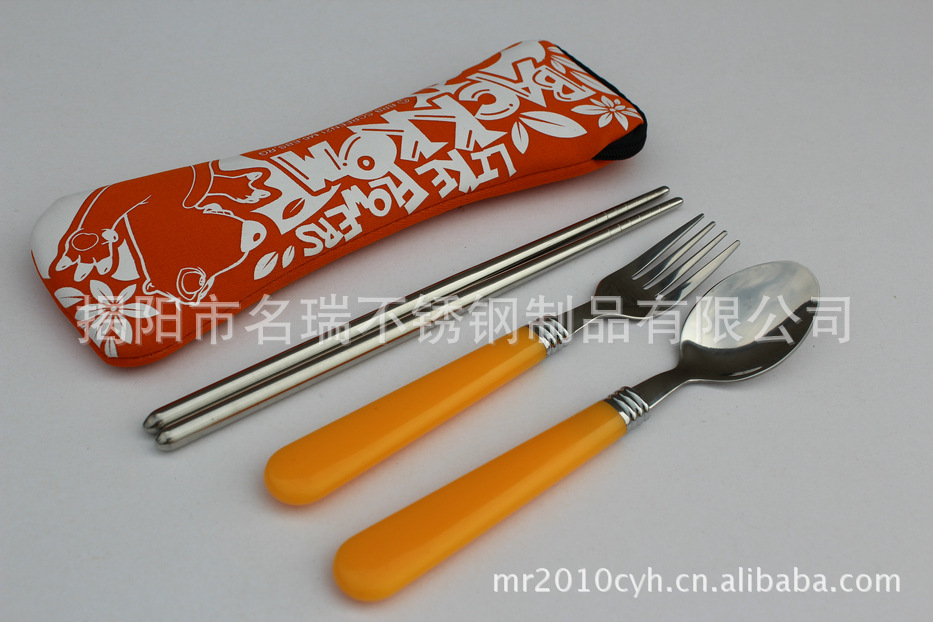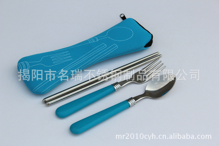 产品名称:塑料扁柄勺叉不锈钢筷布包三件套