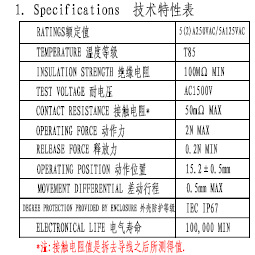 额定值:250VAC 10(3)A, 5(2)A, 0.1A ·125VAC 10.1A, 5A, 0.1A