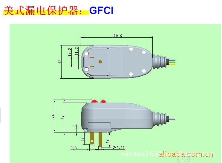 GFCI产品“插头式漏电保护开关”(GFCI产品),是出口北美洲、加拿大国家等新产品,其输入交流电压120V/60Hz,额定输出电流15A—20A,对地漏电流4.0mA—6.0mA,脱扣时间≤25ms,能快速切断电源保护人身安全。其最大特点是使用交流电压范围宽:102V—132V/60Hz,能在+66℃,-35℃下正常工作,能承受6kV/3kA高压冲击二十次不损坏,其耐久性寿命试验长达3000次以上等。
