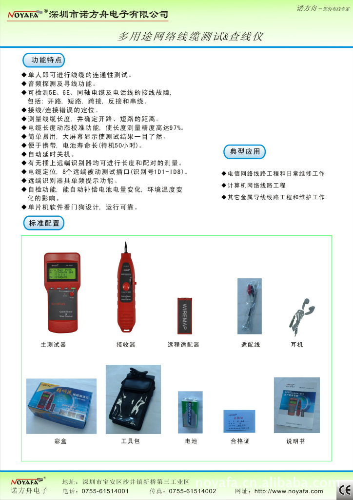 NF-8208型多用途网络线缆测试 & 查线仪是本公司最新研发出来的一款具有更多新型功能的线缆测试和查线仪表。本设备由主测试器(NF-8208),接收器(NF-838-R)和远端识别器三部分组成。该新型仪表外观流畅, 手感好和贴心的人性化设计。它具有寻线、对线及线路状态测试三大功能,具有快捷、准确的特点, 是通信线路, 综合布线, 线路等弱电系统安装、维护工程技术人员的实用工具。广泛应用于电话系统, 计算机网络及其它涉及金属导线线路等领域。
