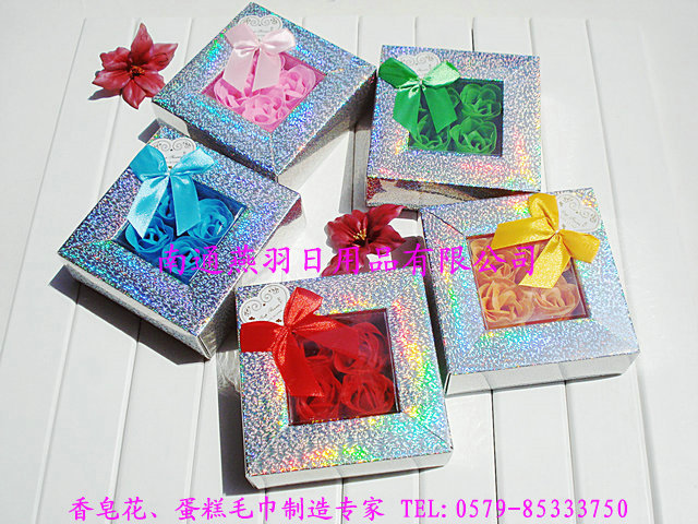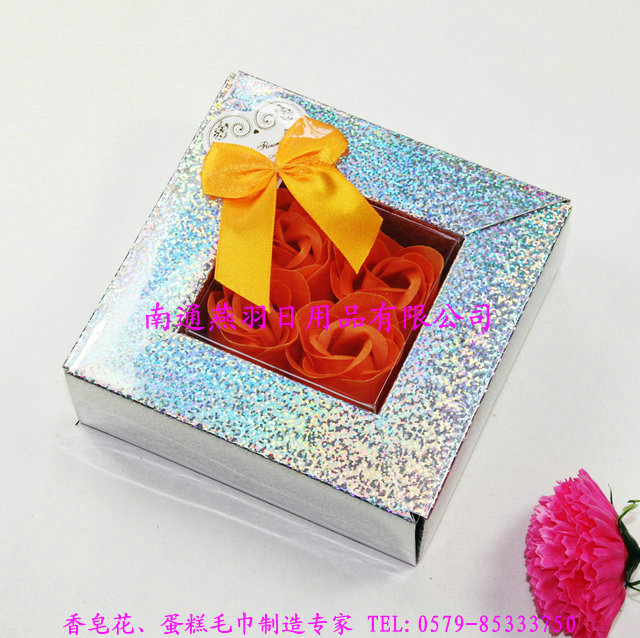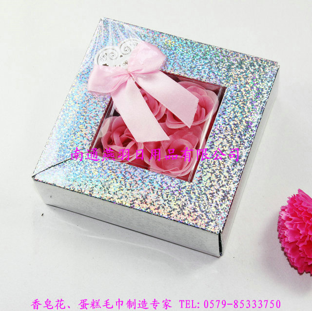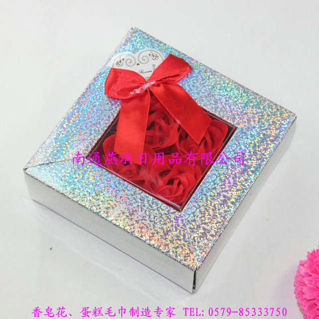包装:正方形亮光纸盒+PVC内盒+蝴蝶结+覆膜