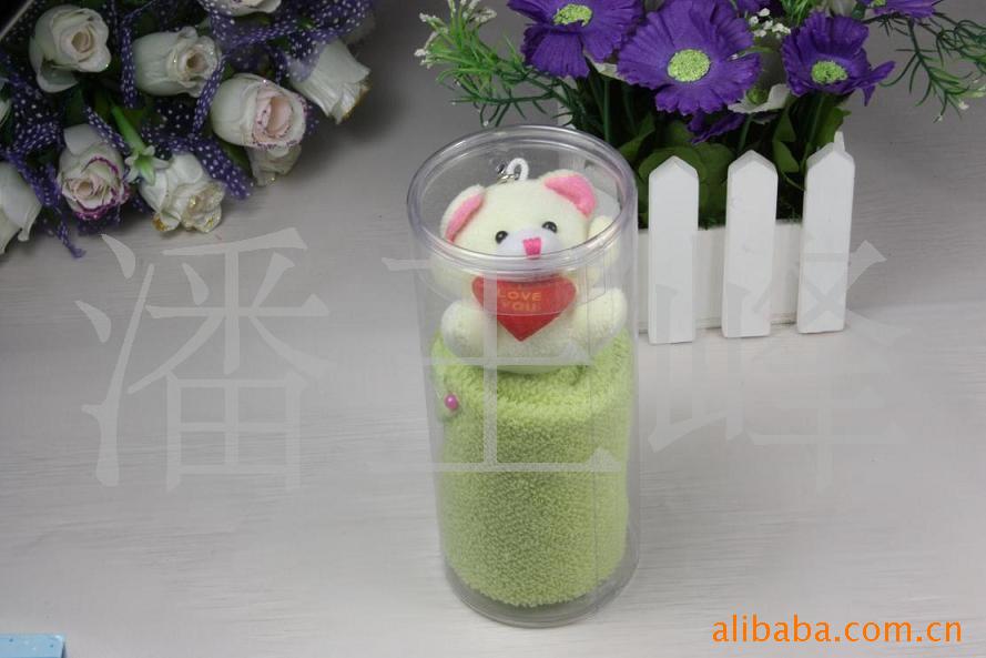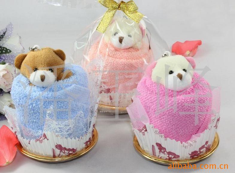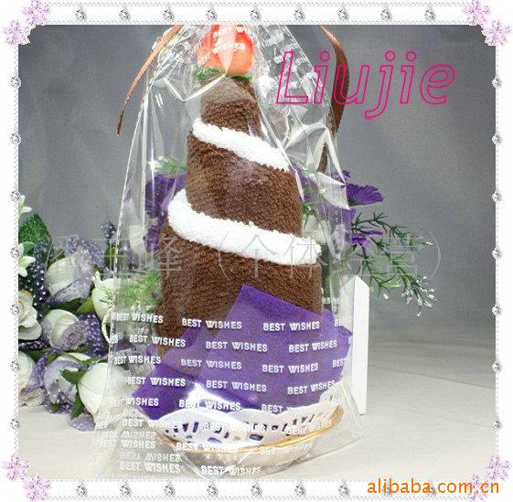 利用毛巾的折叠可塑性及毛巾本身的色彩多样性再添加仿真包装模仿西式蛋糕点心造型和卡通动物造型创意处理出来的仿真毛巾礼品。