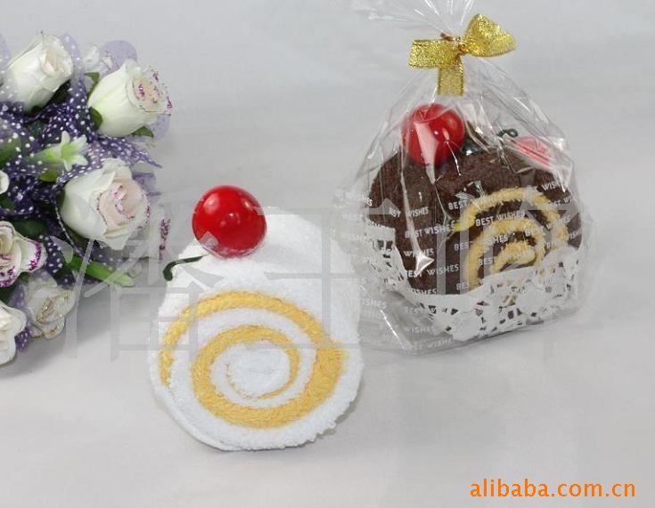 利用毛巾的折叠可塑性及毛巾本身的色彩多样性再添加仿真包装模仿西式蛋糕点心造型和卡通动物造型创意处理出来的仿真毛巾礼品。