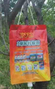 于树干上,斜向下45°角打孔,插入直插输液瓶。 根据树体大小适当增减用量: