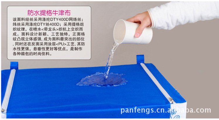 4、防泼水牛津布。出口防泼水牛津布,60升水量防水,为收纳品提供更全面的防护。