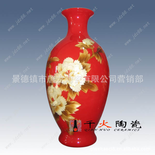 红釉花开富贵系列:包括观音瓶、葫芦瓶、石榴瓶、天球瓶、梅瓶、赏瓶、水洗一共七件。均以牡丹蝴蝶为主题,在以红釉瓷瓶为底色的基础上,彩绘上富贵牡丹、花开富贵、枝繁叶茂、彩蝶翩飞的场景。是整套花瓶精致非凡、雍容华贵。从古至今很多人喜欢牡丹和蝴蝶的组合,是因为牡丹寓意富贵平安,蝴蝶被人们视为吉祥美好的象征,恋花的蝴蝶常被用于寓意甜美的爱情和美满的婚姻,同时表现的人类对至善至美的追求。而蝴蝶在牡丹之上翩翩起舞,则寓意“捷报富贵”。 因此这套红釉花开系列寓意鸿运当头,富贵吉祥,捷报富贵,婚姻美满幸福。是商务往来、婚庆、乔迁礼仪、走亲访友等必备的时尚礼品之一。