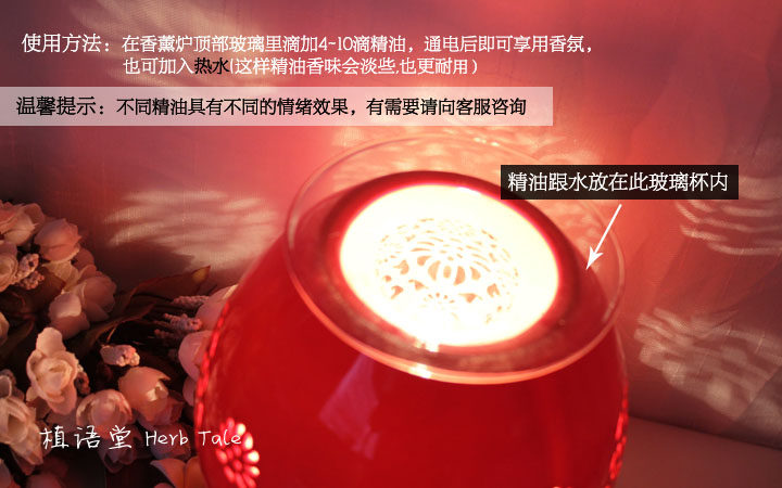 使用方法:在玻璃碟内加入7分满的水,滴上数滴精油,通电即可