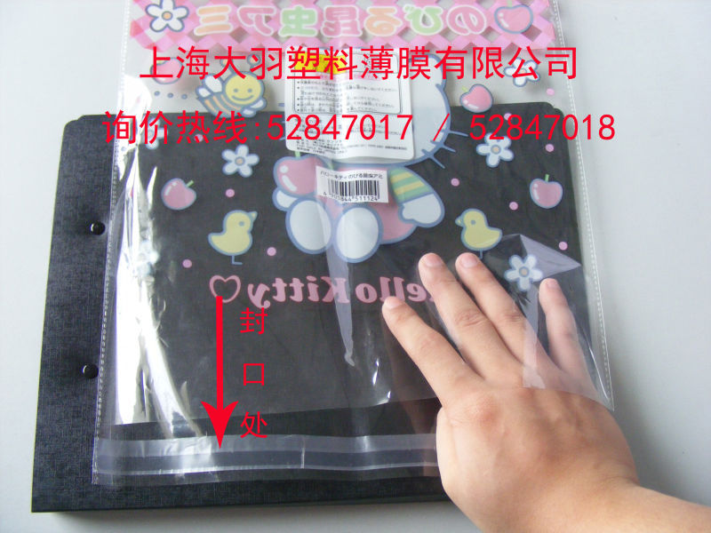 ⑴OPP袋具有透明度高具有垂直感等特征,由OPP单片对折后侧面封边并在开口舌头处粘有自粘封条,使用时装入产品撕去封条表面的保护皮后将舌头对折后粘牢即可,袋子顶部吊卡(珠光膜)和印刷各式艳丽图案,能充分展示出内部产品本质和特色.使用方便、美观大方,还可根据客户需要印刷各种图案及打蝴蝶孔、飞机孔。