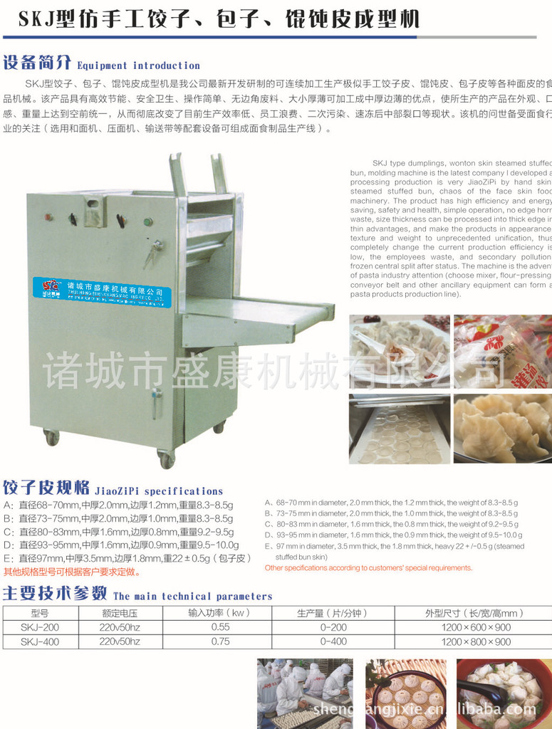 SKJ型仿手工饺子皮机是我公司最新开发研制的可连续加工生产极似手工饺子皮、馄饨皮、包子皮等各种面皮的食品机械。该产品具有高效节能、安全卫生、操作简单、无边角料、大小厚薄可加工成中厚边薄的优点,使所生产的产品在外观、口感、重量上达到空间统一,从而彻底改变了目前生产效率低,员工浪费,二次污染,速冻后中部裂缝等现状。