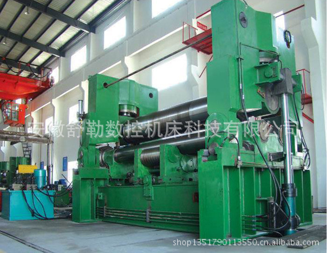 ●液压式三辊对称卷板机关键技术及创新点: 1.省电节能,耗电量只有同类产品的一半; 2. 全密闭设计,防止灰尘进入;一改国产卷板机到处漏油的现象,整体外观达到国外水平。维护保养方便,效率高,寿命长,环保效果好。 3. 全钢焊接结构,设备刚性强,并采用计算机有限元计算分析法进行优化设计计算; 4. 轴辊由中碳钢经锻造及调质处理后进行精加工; 5. 采用电气集中控制,操作简单、方便; 6. 采用整合技术,提高产品可靠性。对主要元件,优先选用国产名优厂家; 7. 控制台采用人性华设计,操作简便方便; ●性能特点: 1.采用鼓形上辊,较小直径的下辊,下辊的下部有上下可调节的托辊支撑。根据卷制制品的负荷,调节下辊下部的托辊,大大提高了制品的直线度。 2.NC控制,高的生产效率;上辊的上下运动NC化,卷板效益大幅度提高,一人作业,操作简单。 3.三辊对称卷板机(带托辊)相对于一般三辊卷板机具有较小的中心距能够获得较短的卷板端部直边,保证较好卷筒圆度。 4.带托辊的卷板机采用横向液压对料装置,增加卷板操作的方便性,减少错边及错角,提高卷板的精度。 ●结构图