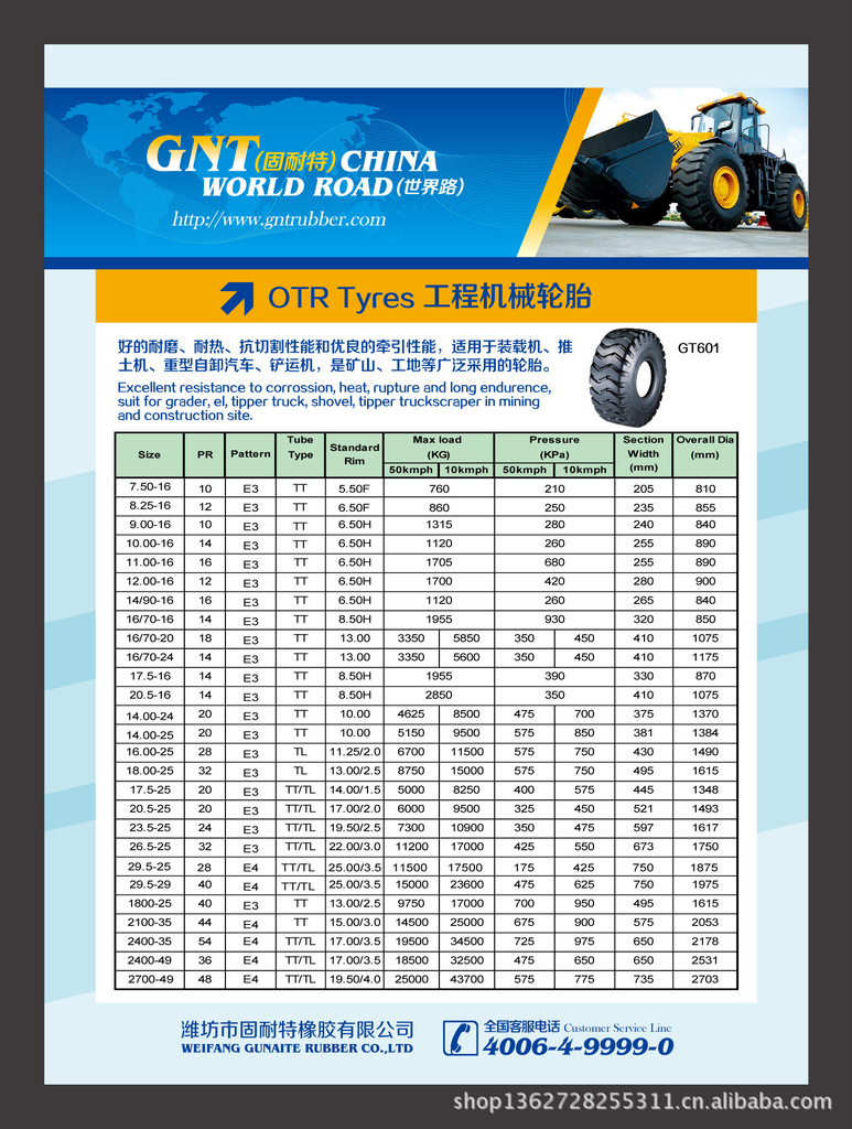 公司主要生产的工程机械轮胎型号如下: