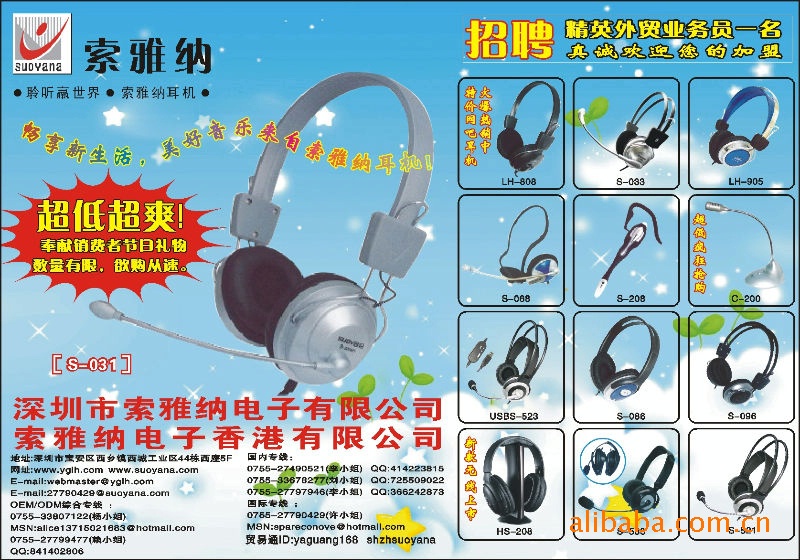 本厂专业生产电脑耳机,麦克风,为给广大客户提供及时方便的服务本厂产品均现货供货和OEM定单生产。现啊里巴巴网上推出我们的形象产品,索雅纳和克诺威系列产品,结合10年的市场销售,我们形成了一整套公司管理及产品信息,方便行业人士提供批发和OEN定单,用最少资金拿最好的产品。批发价格区间:5-120元左右,大到零售为10元-320元,主生产产品:电脑耳机,电脑麦克风,MP3耳机,USB耳机,手机耳机,无线耳机,键盘 鼠标几大系列多种品类,本产品全场支付宝担保交易货款俩安全。 我們的宗旨是追求産品質量卓越,信奉顧客至上的商業道德;嚴守精誠協作的商業原則.