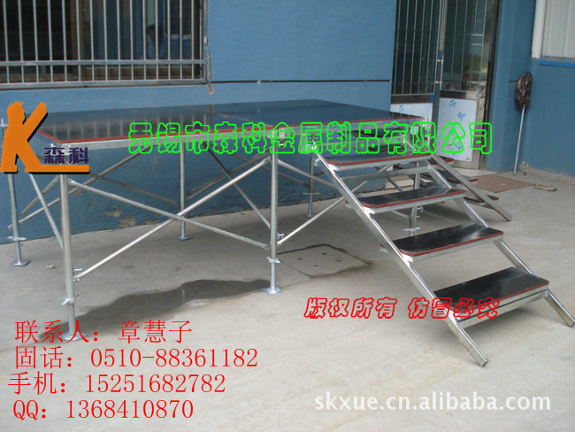 2.钢制斜拉舞台参数:¢42.7*2.4mm;舞台框1220*1220*1.5mm;面板尺寸:1220*1220*18mm,舞台立柱采用国标Q235脚手架专用钢材,管径42.7mm,壁厚2.4mm,表面镀锌处理;舞台板是18mm厚建筑胶合板,双面覆膜,表面防水。舞台的承载力:舞台板子(不加下面钢铁框架),四个端角支撑可以平均承载四个人,舞台框架加板子,平均每个平方可承载400KG;