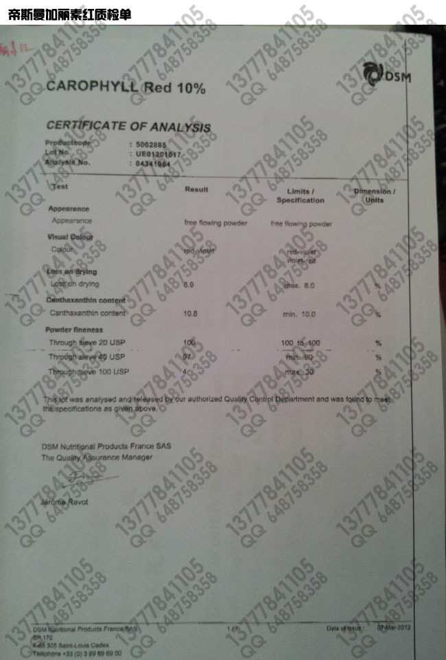 【含量】:加丽素红含有10%斑蝥黄质(Canthaxanthin Powder 10%)