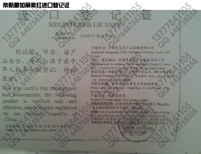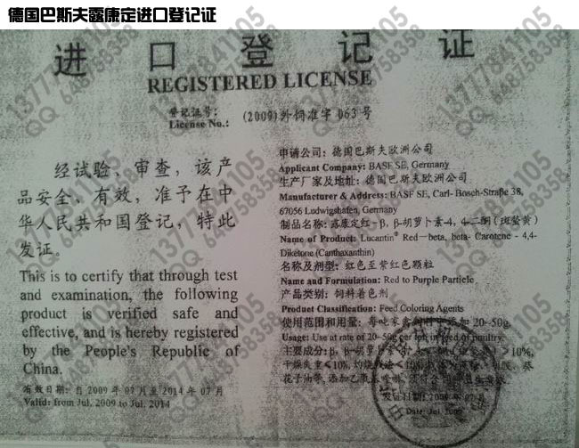 ◆加丽素红(Carophyll Red)即天然红色素,天然色素是属于一种天然的生理性色素,这种天然色素包括胡萝卜素(Carotene)以及之为“类胡萝卜素”(Carotenoid)者,诸如阿朴胡萝卜素(Apocarotene)虾青素(Astaxanthin)及斑蝥黄质(Canthaxanthin)等等,目前,用于蛋黄的著色,类胡萝卜素之中以斑蝥黄(Canthaxanthin)的生物性能研究得最为透彻,并且效果卓越。瑞士罗氏大药厂经多年的研究,证明在饲料中添加剂加丽素红时,有显着效果,因此乐于向国内鸡鸭场推荐使用,以提高产品的商业价值。