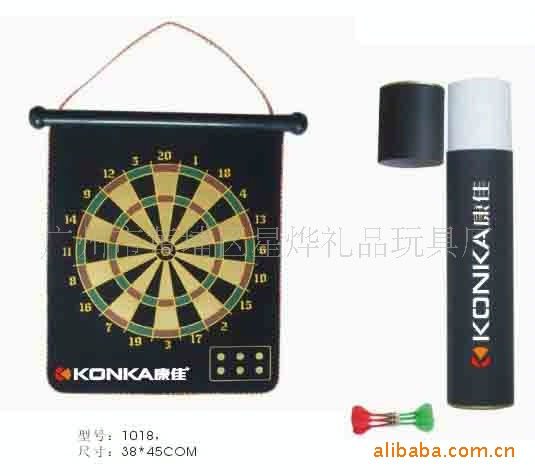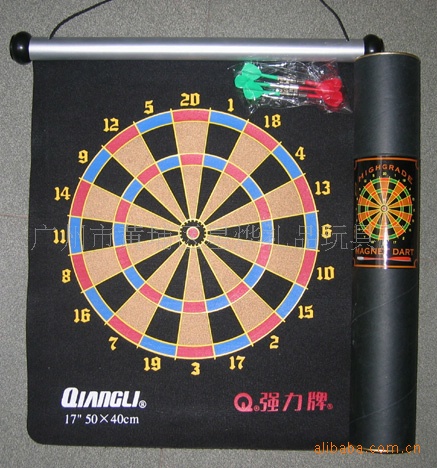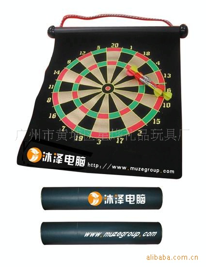 14)绒布飞镖靶:采用双面贴绒布单面或者双面印刷+中间铁粉胶+塑料管条+塑料管头+6支4号全塑飞镖+挂绳
