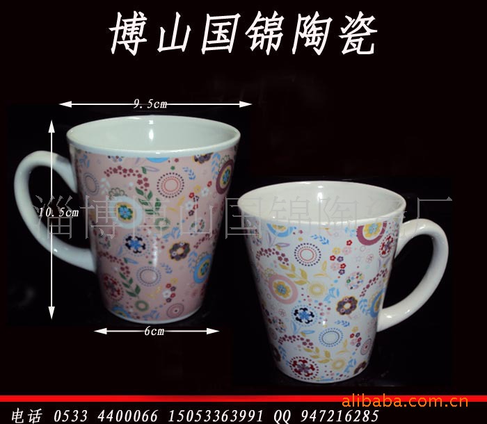 淄博博山国锦陶瓷厂是以生产骨瓷.强化瓷.炻瓷.白瓷为主要瓷质的生产厂家,公司拥有先进的生产制瓷技术,年生产能力1000多万件。主要生产和销售镁质强化瓷、骨质瓷,新骨瓷、白瓷、炻瓷、颜色釉的专业厂家,主要生产各类陶瓷中西餐具,咖啡具,茶具,马克杯、咖啡杯,广告杯、新骨瓷杯、变色杯,音乐杯、促销礼品餐具、促销礼品茶具等 ,针对国内国外客户,外贸客户,兼营陶瓷出口业务。 陶瓷马克杯是一种经济的广告途径,企业可根据广告促销需要,将商标及信息加工到杯身上,以杯为广告载体,为你传播信息,是非常实效的广告。我司专业制作陶瓷广告杯,,款式有上千余种,颜色丰富。可以定制企业和公司LOGO,做为广告赠送礼品,或者促销活动中使用。陶瓷材质分为高温白瓷,强化瓷,骨瓷等。客户可以自己选择杯子材质和款式,或者我们根据客户需杯子用途为客户推荐款式。我公司专业知识丰富,质量控制严格,给每一个客户提供高质量的产品。