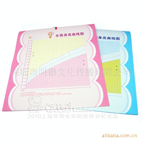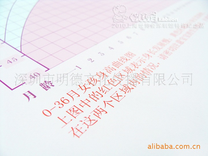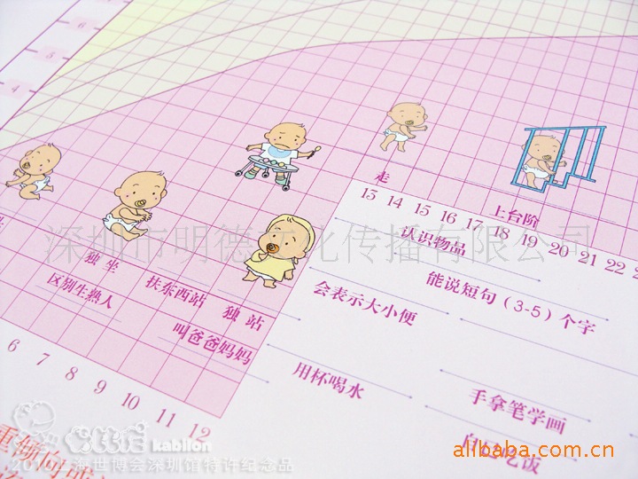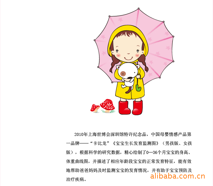 2010年上海世博会深圳馆特许纪念品,中国母婴情感产品第一品牌——“卡比龙”《宝宝生长发育监测图》(男孩版、女孩版),根据科学的研究数据,精心绘制了0—36个月宝宝的身高、体重曲线图,并描述了相应年龄段宝宝的正常发育特征,能有效地帮助爸爸妈妈及时监测宝宝的发育情况,并有助于宝宝预防及治疗疾病。