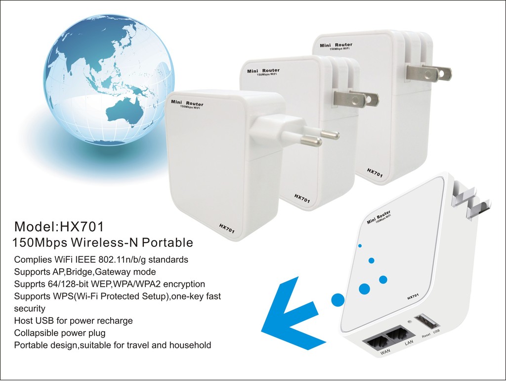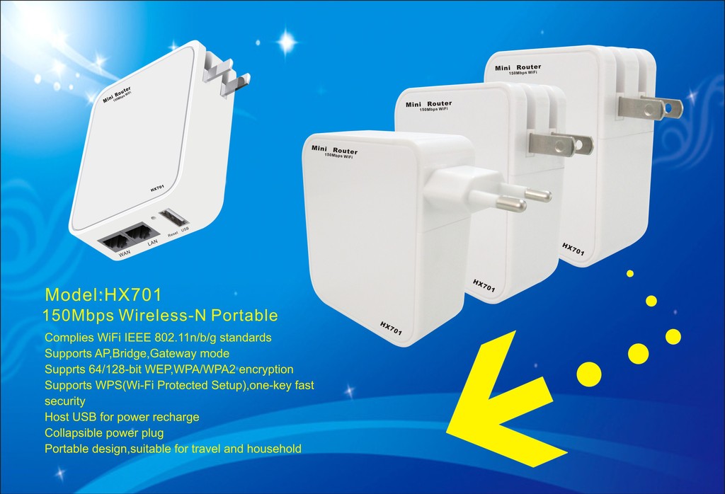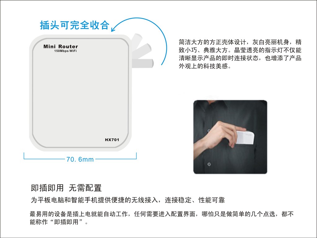 就是一款真正做到即插即用的无线路由器。出差或旅行途中入住酒店,只需网线插到 以太网口(网线另一端需连接到酒店房间已连网的网口插座),整个房间就已经是Wi-Fi无线覆盖了。此时,你便可以拿出你的手机、Pad或是其它任何支持Wi-Fi无线上网的设备,在房间任何地方无线上网,完全不需要任何设置。 平板电脑和智能手机用户设计的一款Wi-Fi接入器,精巧便携、性能优越、即插即用,让旅途中的无线更享受。