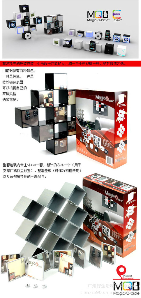 小二国内首发,Magic-Q-Bicle魔方盒在英国上市后非常受欢迎,主要也是针对目前个人数码类产品越来越多,如何最好的整理这些小物们是大家都很犯愁的事情,Magic-Q-Bicle的出现,能够将艺术与装置巧妙结合在一起,无论是在家还是办公室,都可以将你的数码小东东们集合在一起,给他们安个家。同时价廉物美,包装很精美,送礼非常合适。