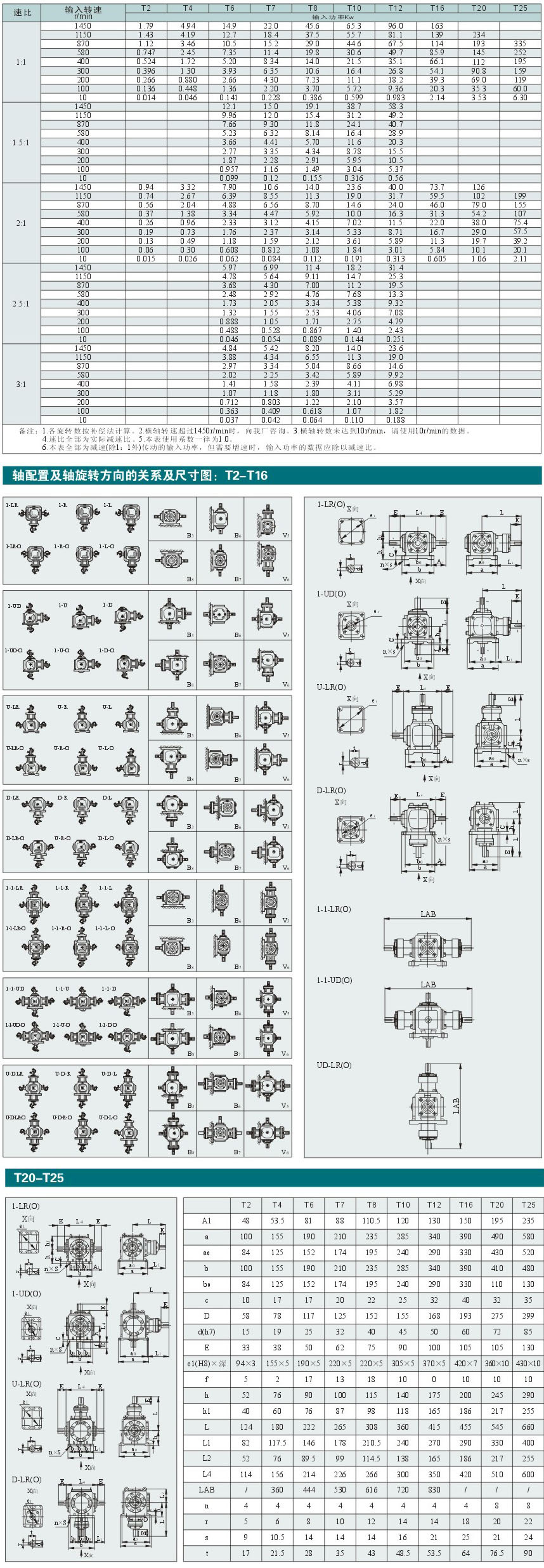 小型的最大速比只有2:1,有部分机型可以达到5:1大速比,并且大速比价格另议。 该机具有多种组装结构,上下左右共有24种组装旋转配置方式,可分单向轴和双向轴输入或输出,也可以空心轴装式输入或输出。 扭矩大、噪音低、设计合理、适用于任何机械传动领域和机械转向领域。 安装尺寸见下表:请根据不同的用途选用不同型号(例:T7-1.5:1-1-LR-V5),具体组合参数可参考我公司网站,也可来电向我公司索取产品手册,我们会真诚的为您服务。 同心协力,达成梦想——“同达”牌减速机,信誉+品质=您的选择。