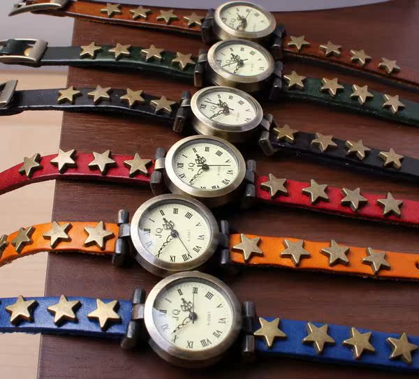 速卖通淘宝爆款 时尚达人青古罗马五角星 真牛皮手链表 女士手表
