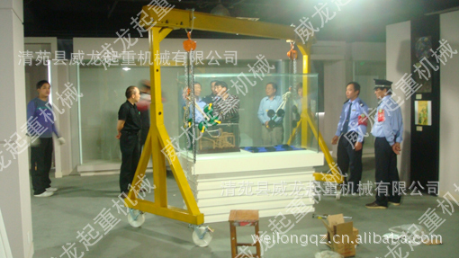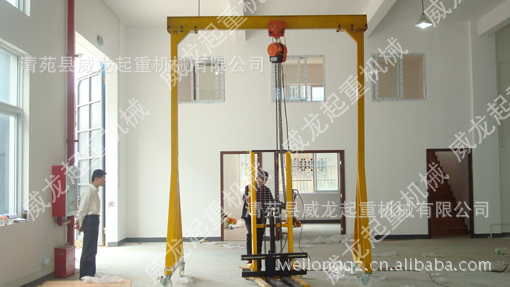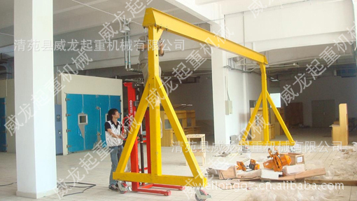 移动式起吊小型龙门架是清苑县威龙起重机械有限公司根据中、小工厂(公司)日常生产需要搬运设备、仓库进出货,起吊维修重型设备及材料运输的需要,开发出来的新型小型起重龙门架。适用于模具制造及安装、汽修厂、矿山、工地及需要起重的场合。