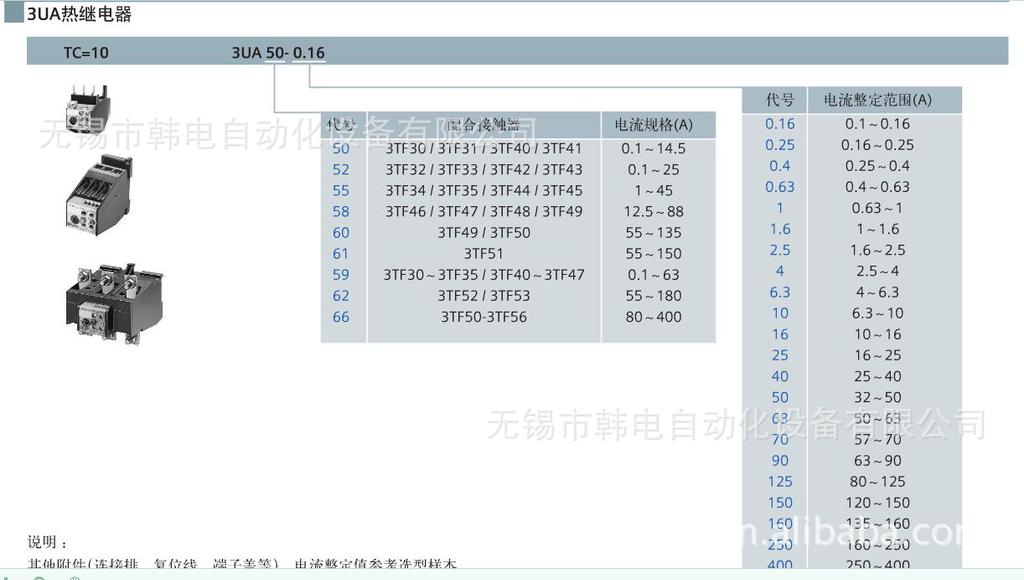 3UA 热过载继电器------3UA系列热过载继电器适用于交流50Hz/60Hz,电压690V-1000V,电流0.1-400A的长期工作或间断长期工作的一般交流电动机的过载与断相保护,也可用作直流电磁铁和直流电动机的过载保护。 ------继电器具有断相保护,温度补偿,脱扣指示功能,并能自动与手动复位,动作可靠,符合IEC947-4,VDE0660,GB14048等标准。 ------继电器可与接触器接插安装,也可独立安装。