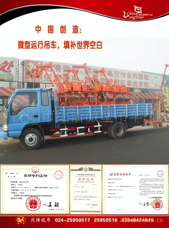【中国创造】微型运行吊车:占地1平方米多、机身紧凑、宽度仅有0.7米,长度1.6米,可推进电梯间,顺利进入狭窄现场。吊载:200-800公斤;标准型:吊高3.0米;加高型:吊高约4.5-7米三种可选(外配接长杆/每节杆约1.5米);借高吊装:30-40米。小巧轻便、起吊速度平稳快捷、自重400公斤、可随意拆零搬运、易组装。可上房、可进屋、进入狭窄空间、有手电两用、手摇微升、微降(独特的手摇对焦功能,上下左右前后全方位调整焦距、确保您吊装稳准到位、分毫不差)吊物后吊杆角度可调、可向前够物吊装、拥有较大作业半径、原地旋转360度、可移动、也可配备吊人筐等等功能。有36伏安全操作电压、超载自动停电、自动报警、有线遥控、手动紧急刹车、最高限位等装置。具有构思巧妙、操作简单、性能卓越等特点。