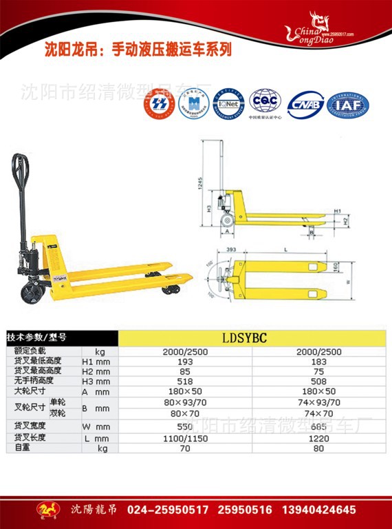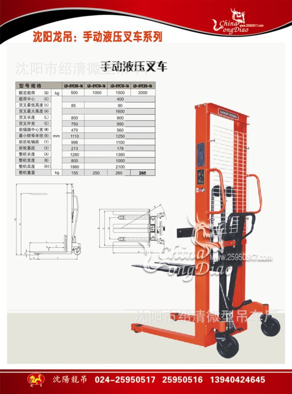 3。手动叉车 :1-1.5-2-3吨/1.6-2-2.5-3米高,欧美标准、锰钢门架、锻叉货叉宽窄可调、德国进口密封件、两年保修、终身维护、提供原厂配件、24小时上门服务