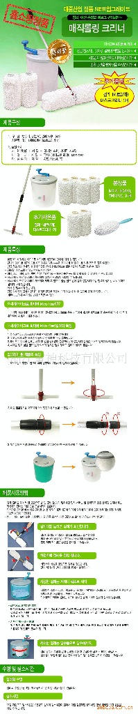 (一)乾濕兩用魔術旋轉拖把 你還在用一次只能拖一面的舊型拖把嗎????趕快把他換掉吧!! -----將拖把手柄桿一轉動,除塵滾筒即可旋轉,由一個清潔面可轉變為至少五個清潔面,即一支清潔拖把可達到至少五支拖把的清潔面積,亦則清掃一個房間只需旋轉滾五分之一面積左右即可完成,完全免去傳統拖把因髒污而必須來回清洗的時間.