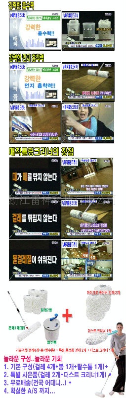 1.乾濕兩用,專利產品。 2.全日本電視購物台熱賣商品銷售排行榜第一名。 3.韓國世界杯足球賽區大會指定清潔工具之一。 4.吸水性能是普通拖把的3倍。黏附灰塵能力是普通的4至6倍。清潔面積是普通拖把的5倍。使用壽命是普通拖把的6倍。 5.亦可取代抹布/掃帚/擦窗器/掛衣叉/吸塵器具。 6.可連續循環使用清潔五個房間,適用於地毯/木質地板/花崗岩/地磚/水泥地面等材質。 7.本產品乾濕兩用,效果更顯著於油污除塵方面。 8.多用途功能的旋轉機械裝置,能減少勞動量,快速清潔,不留污漬,吸水痕。
