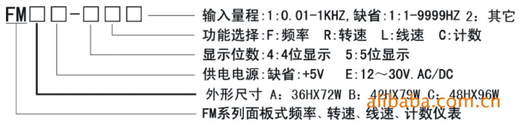 ※规格特征 型号 | 测频范围 | 测量转速范围 | 计数范围 | 量程转换 | FMA-4FR | 1-9999Hz | 60-9999Rpm | 0-9999 | 自动 | FMB-4FR | 1-9999Hz | 60-9999Rpm | 0-9999 | 自动 | FMC-5FR | 1-19999Hz | 60-99999Rpm | 0-99999 | 自动 |