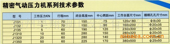 本机是继J1350系列气动压力机之后,推出的又一新型气动压力机械,本机具有运动平衡,无推动,无噪声,无油污(采用无给油润滑技术).本机还具有精度高,合模容易,探作方便,压力行程,速度,保压时间可调,加工零件可计数的优点.适合各种电位器,电容,仪表,行程开关等金属件,胶木件,塑料件等合成形,冲孔等工艺.