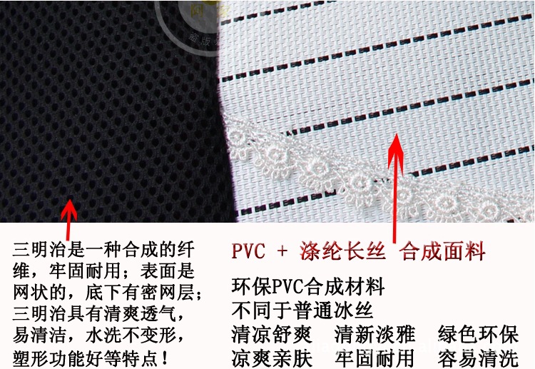 宝贝前面是三明治面料:具有透气、舒适、细腻手感、减少静电等作用,适合电脑绣花,是做通用座套比较理想的一种面料;背面是菠萝布:具有增强弹性的作用,使宝贝更加容易安装。
