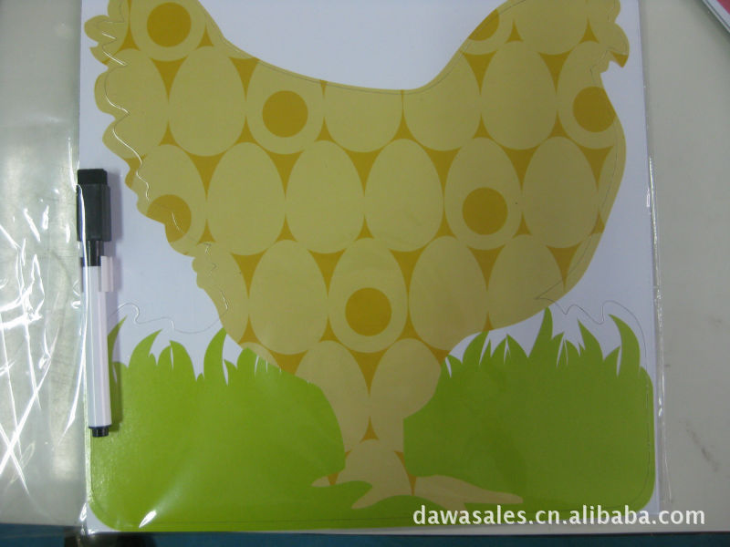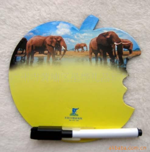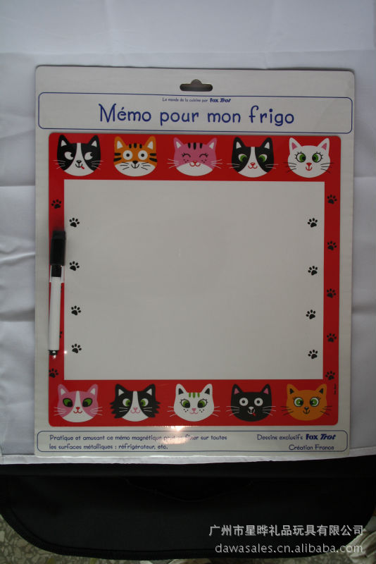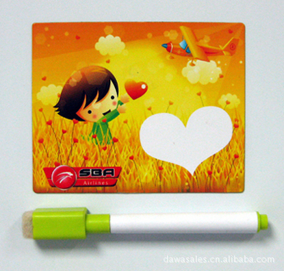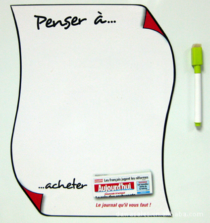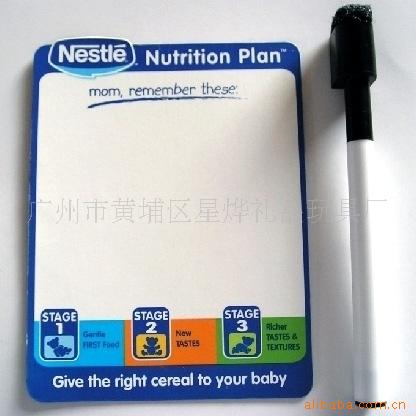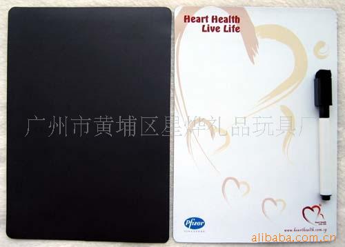 4)磁性留言板 白板:采用软胶磁铁(或纸板)+铜版纸四色印刷裱光膜+可擦笔