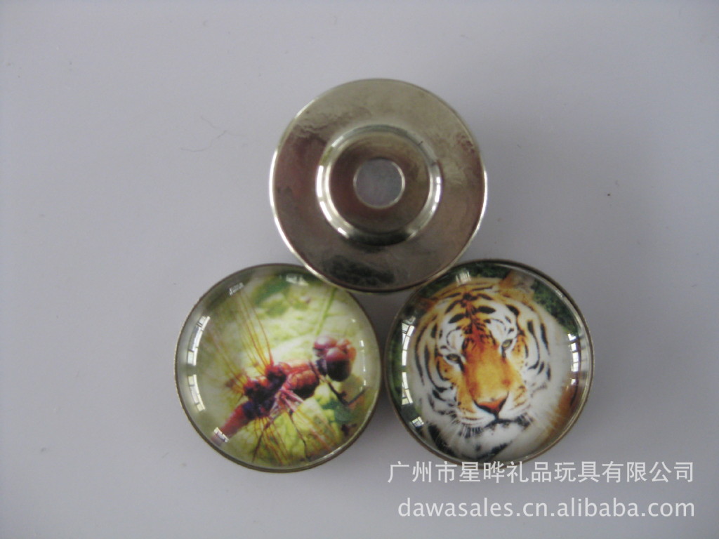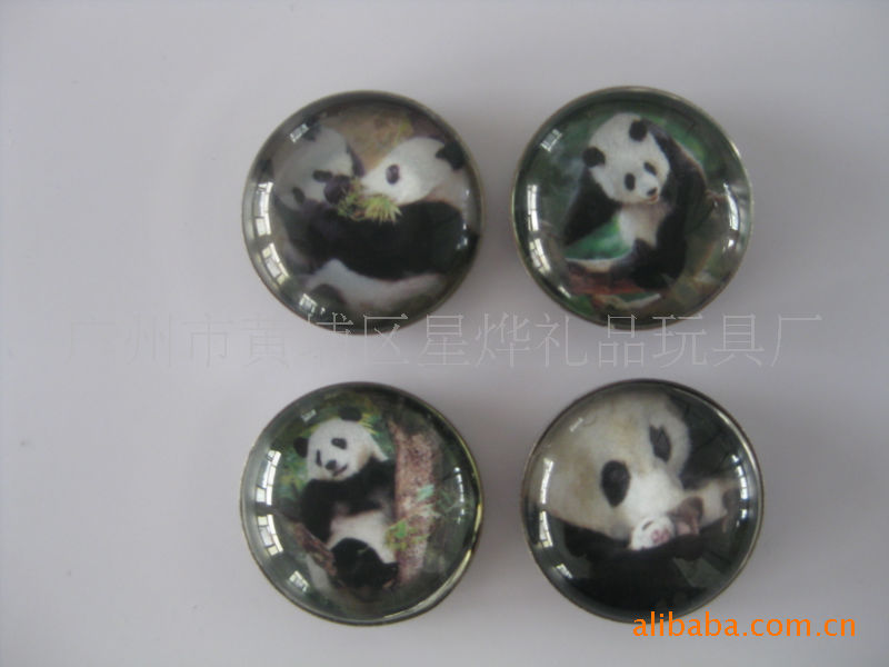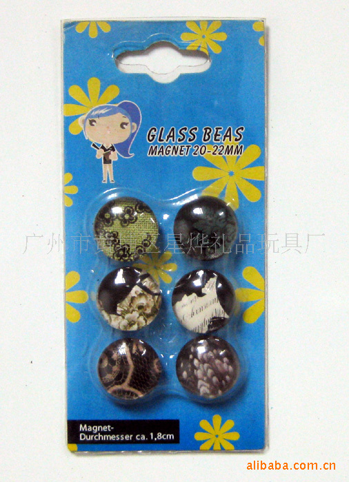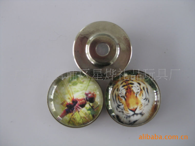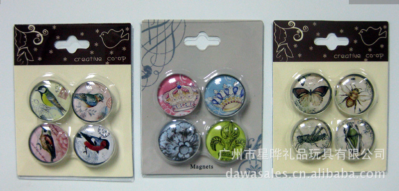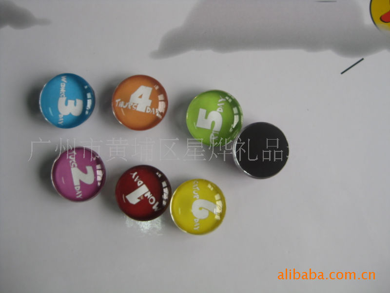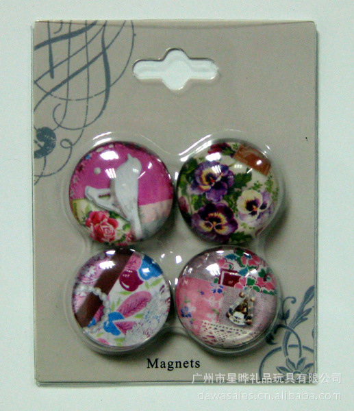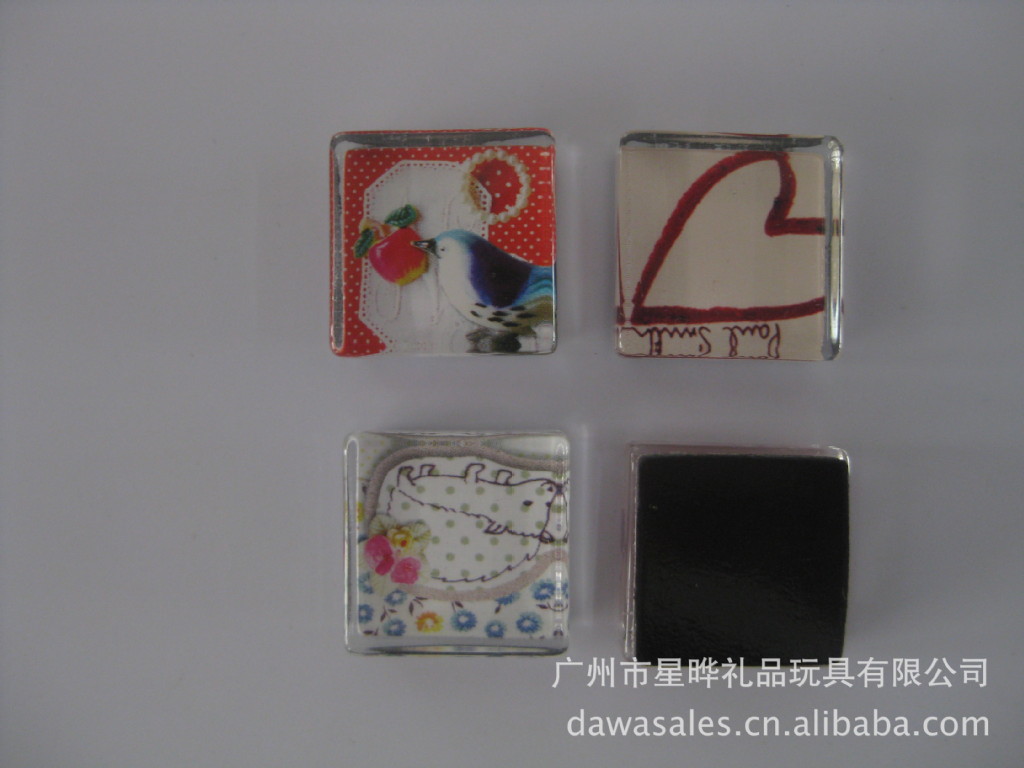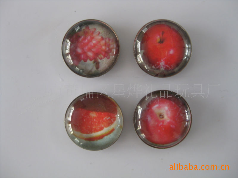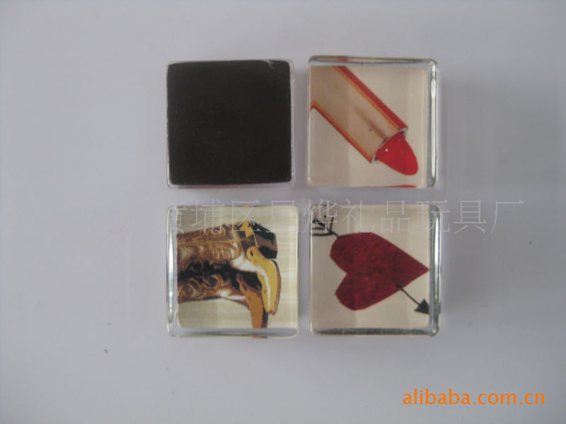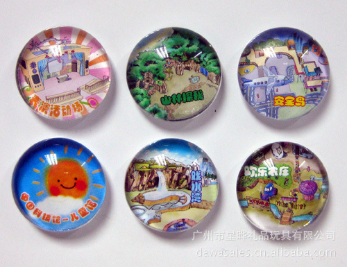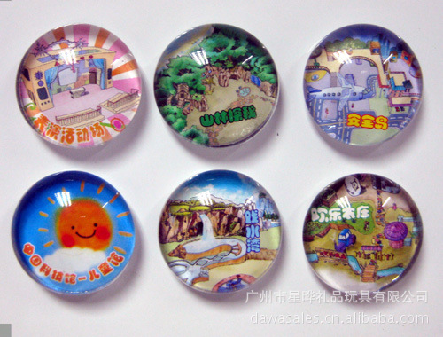 11)玻璃冰箱贴:采用下面软胶磁铁+上面铜版纸彩色印刷+半圆玻璃窗腹膜制作而成