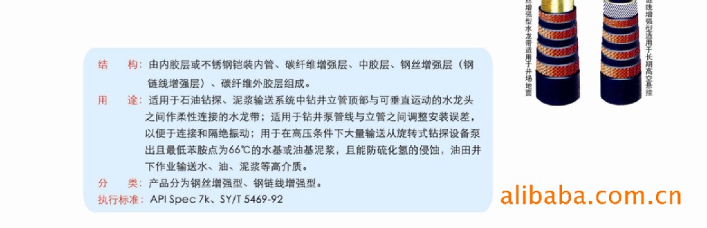 产品结构:由内胶层、内胶保护层、中胶层、钢丝缠绕层和外胶层组成。产品用途:钢丝缠绕钻探胶管用于油田固井、修井及石油地质勘探、小型钻机和水利采煤、输送泥浆及常温水等流体介质。