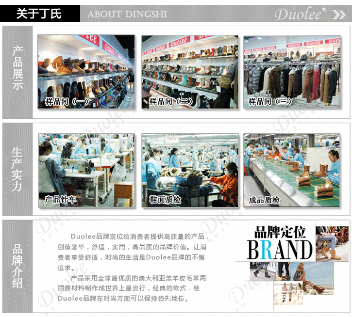 广州市丁氏鞋业(www.dingsxy.com.cn)创建于2007年,座落于中国最著名的世界级“鞋都”——广州,是一家长期以设计、生产加工和批发销售毛革一体雪地靴为主的企业。