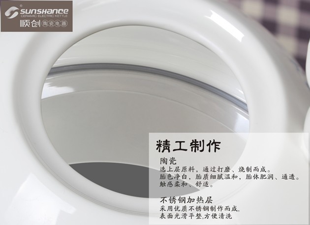 顺创简介 广东潮州市顺创不锈钢制品有限公司是目前家用陶瓷电器行业中的一支迅速崛起的生力军,公司集研发,生 产,销售为一体企业,现已开发投产产品有,电热水壶,陶瓷炖锅两大系列产品。 创新是顺创能够在竞争日趋白热化的小家电行业中能够始终占一席的重要原因.顺创人清楚地认识到只有在技术研发和产 品开发永远比别人领先一步, 我们才有机会得以健康持续发展下去, 因此, 顺创在熟练掌握现有技术的基础上放眼世界, 积极创新, 不断寻求技术上的突破, 致力于国内外的陶瓷技术及传统工艺研发,结合国外先进的电器制 造技术及国内传统陶瓷工艺,以打造简约、时尚、环保、健康的现代家用陶瓷电器,以“绿色环保、营养健康、美观时尚”作为产品的研发主题,推出了一系列具有现代时尚环保元素的养生陶瓷电器新品,深受国 内外广大消费者的喜爱。 顺创先后开发了一系列在同行中独树一帜的全新产品,凭借雄厚的技术和独到的眼光,顺创在产品开发上不拘一格, 目前产品范围覆盖了高档不锈钢水壶,陶瓷水壶, 玻璃水壶, 电炖锅, 隔水炖, 家居陶瓷, , 把掌握的技术得到充分的利用, 同时又在制作不同范畴的产品的过程中钻研出新的技术, 使顺创被评为家用陶瓷电器行业中最具发展潜力品牌。 顺创贯彻 “一站式” 的服务宗旨, 从销售, 产品开发, 生产, 质量控制, 售后服务, 每个环节都由经验丰富的人员严格把关, 务求为客户提供全方位, 高质,高效的专业优质服务. 公司产品获、CE、CB、GS等 国内、国际认证, 以严格的质量管理、可靠的信誉为保证,以强劲的实力、庞大的营销网络为依托,诚结海内外客商,欢迎广大客户亲临参观或电函洽谈业务!愿顺创与您一道走向辉煌! |