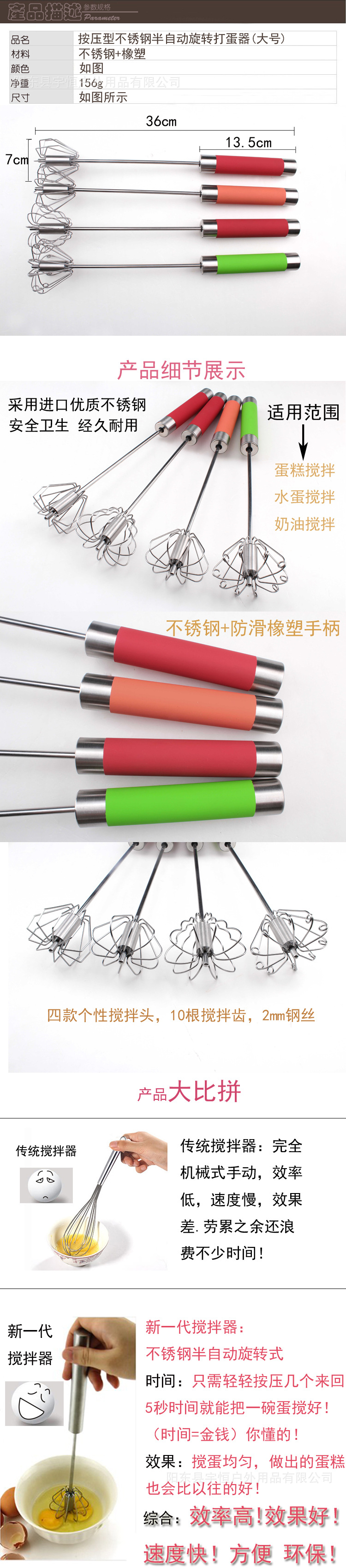 欢迎订购厨房用具搅蛋器按压型不锈钢半自动旋转打蛋器(大号)手柄不锈钢+橡塑