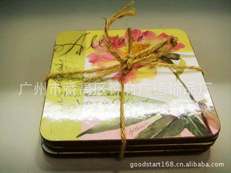 1.中纤板软木杯垫:彩纸印刷过胶+中纤板+软木+边油