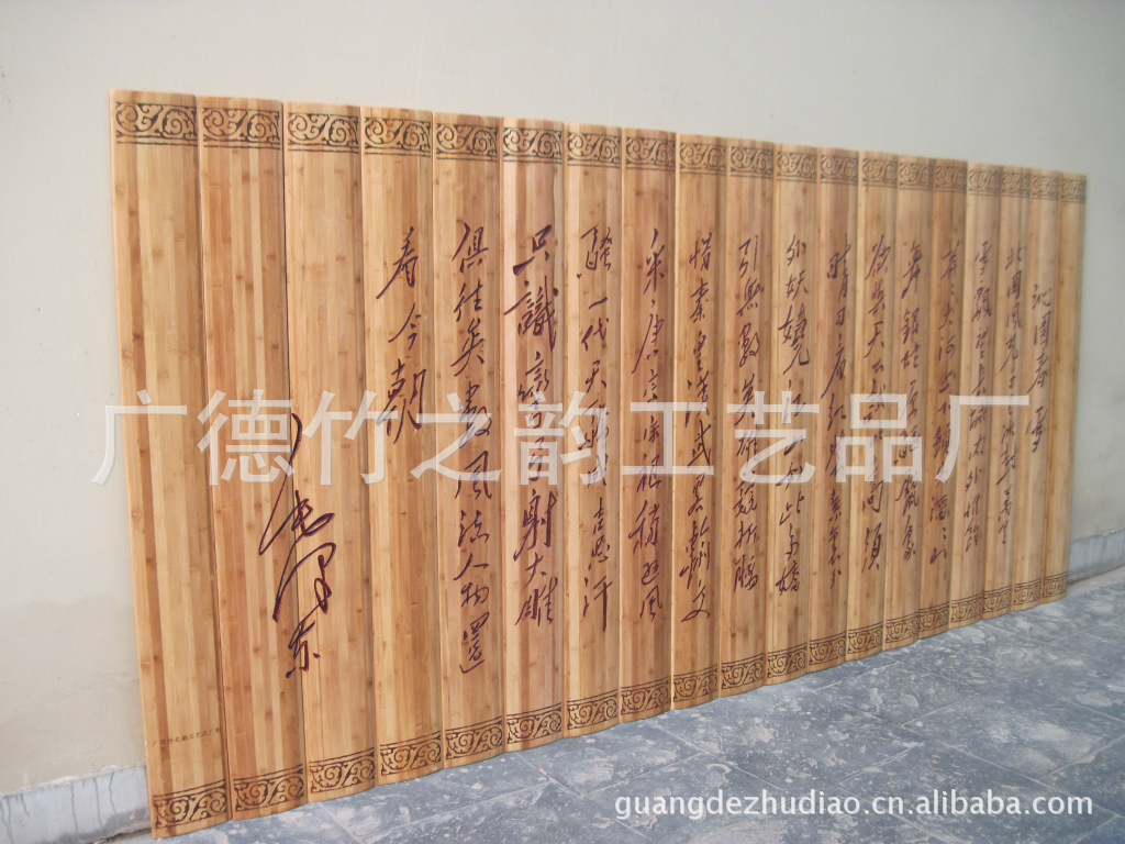 产品用途:是特色旅游纪念、亦是馈赠亲友的上好礼品.实用与观赏性兼具,是书房及各类办公场所的高档文具用品和高档工艺摆设;由于竹简保存时间长,并含有祥瑞喜庆之意,因此不论是装饰还是收藏,都深受人们的喜爱。竹简工艺品可以包容诗辞歌赋、花草树木,可以再现历史经典,也能表现现代艺术。从巨幅字画,到精微装饰。可以说竹简工艺品就是一个微缩的艺术展台,具有丰富的文化内涵,雕工精美,古香古色、朴实耐用,将它陈列在室内,一定可以增添几份儒雅和淡定的气息。