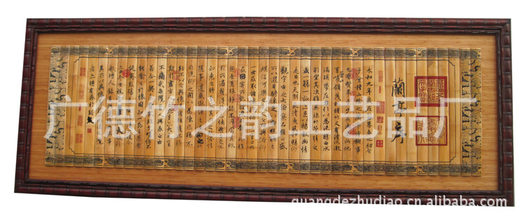 广德竹之韵竹雕厂是竹简工艺品、竹雕、竹简工艺品、竹简礼品、竹雕字画、竹雕对联等产品专业生产加工的公司,拥有完整、科学的质量管理体系。广德县竹之韵竹雕厂的诚信、实力和产品质量获得业界的认可。欢迎各界朋友莅临参观、指导和业务洽谈,公司处在资源丰富和政府支持的优越的投资环境下,在大力稳定国内市场的同时,也在不断地开拓国际市场,努力的强化专业技术人才的培训,全力专注于产品开发与创新!