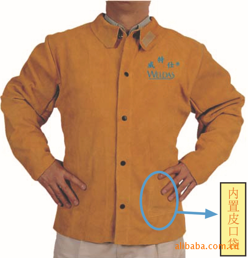 金黄色焊服由隔热、耐磨的牛二层皮制成。采用高拉力、阻燃的杜邦Kevlar 防火线缝制。