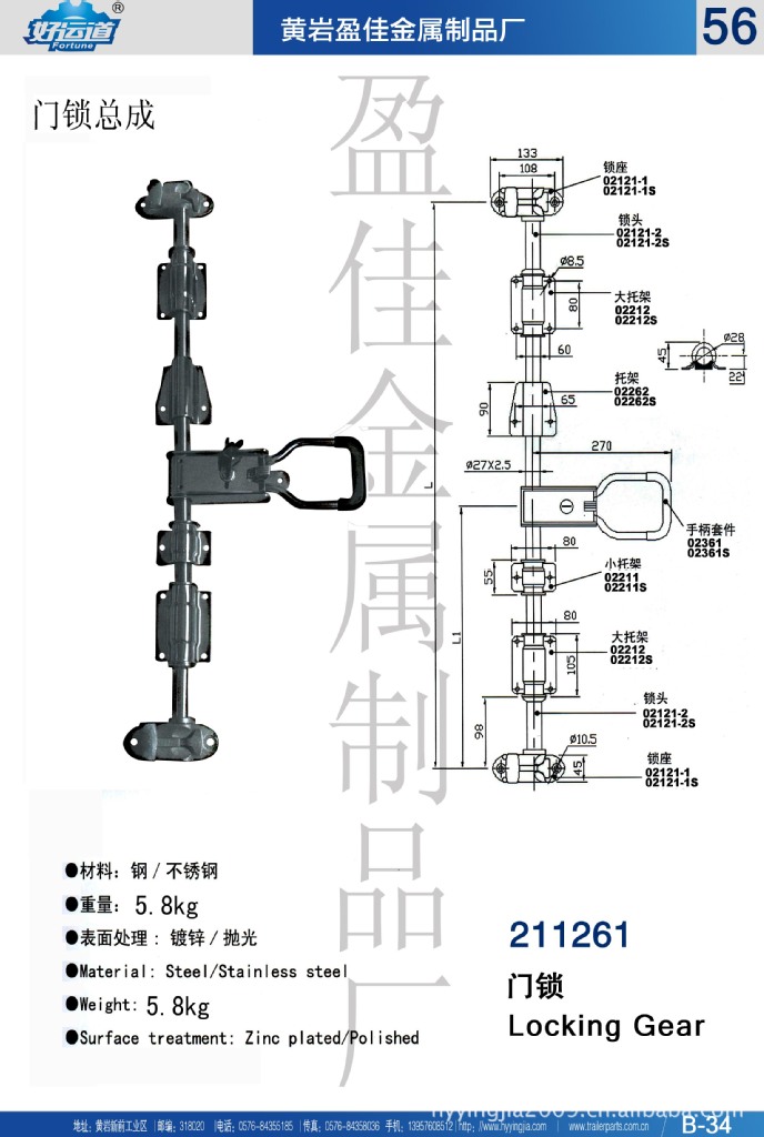 新前盈佳金属制品厂位于浙江台州黄岩,黄岩素有中国“模具之乡”,“蜜桔之乡”,“踏板摩托车生产基地”之称,在模具设计开发制作方面有着得天独厚的条件。我厂从事各类五金制品的开发生产已有将近20年的行业经验。为各类制造业和民用产品定制加工各类五金及塑料制品。加工工艺涉及冲压、锻造、压铸、精密铸造、注塑、挤出、精加工等。产品涉及的行业有商用车、特种车行业、摩托车行业、发电设备、冷库、粮库、储备库、船舶五金,家具五金、装饰五金及其他工业五金。在民用产品方面有合页、插销、门锁、工具箱锁、滑轮、拉手等。在这20年的发展历程中,我们积累了丰富的模具、五金加工经验,不断提升专业技术,也汇聚了五金行业的各类专业技术人才,其中有冲压模具技师、锻压模具技师、精密铸造及压铸模具技师。 在2000年成立的商用车配件事业部专注于商用货车配件的开发与生产,经历了12年的经营与发展,到目前为止已经可以为以下商用车品种提供全套的配件解决方案,其中包括厢式车·配件、集装箱·配件、冷藏车·配件、保温车·配件、车载工具箱·配件、半挂车·配件、改装车·配件、军 用方舱·配件、拖车·配件、软篷车、展翼车·配件、流动营房·配件、移动发电机组·配件、消防车·配件、工程车·配件、物流装备、货物捆绑类工具。产品品种达到一千多种,其中包括厢式货车门锁、不锈钢车门锁、集装箱门锁、冷库门锁、烘箱锁、电柜锁、盒锁、军 用方舱锁、机械锁、埋藏式门锁、集装箱铰链、厢式货车铰链、侧门铰链、车厢门铰链、不锈钢铰链、钢琴铰链、军 用方舱铰链、冷藏车铰链、机械铰链、烘箱铰链、厢式货车合页、半挂车合页、不锈钢合页、集装箱合页、仓栅车边板合页、汽车密封条、橡胶密封条、厢式车密封条、集装箱密封条、三元乙丙全胶密封条、保温车密封条、货车包边铝型材、栏板助力器、压翼搭锁、展翼车合页、舞台车锁扣、搭扣、厢扣、栏板包边、转向灯、车灯、车用橡胶件、集装箱角件、不锈钢拉手、钩锁、轻型锁、活动立柱、导轨、带扣、篷布、滑轮、紧篷器、罗兰、护板、撑杆、车厢隔货条、铝合金护栏杆、减震块、插销、楔形锁、固定销、门阻、卧环、地板勾、拉紧器、脚踏、梯子、平钩、S钩、D型环、紧绳器、绳勾板勾等车身附件、冷藏车挂肉钩、冷藏车挂肉钩滑道、通风槽、消防车卷帘门、卷管器、绕管器等。产品表面处理有电镀锌、热镀锌、镀鉻、发黑、电泳、喷塑、不锈钢抛光、化学抛光(不锈钢电解抛光)、达克罗等。 我们专注品质的掌控和自身品牌的建设。在2010年,我们针对商用车配件注册了“好运道”商标和物流装备系列的“左右手”商标。并在2012年经过严格的审核程序,我公司通过了ISO/TS 16949:2009质量体系认证。我们的目标是希望成为中国乃至世界的商用车行业优秀的供应商。我们将用一颗感恩的心对待客户和员工,用专业的精神对待产品,把每一个产品都当成是艺术品,用百分百的精神投入事业,为制造业贡献出我们的一份力量。