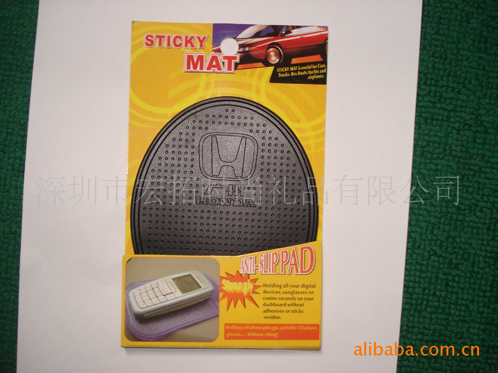 汽车防滑垫也称手机防滑垫,也有PVC车载防滑垫。通常是用一种叫PVC软胶的高分子材料做成,底部平坦,因为高分子性吸附能力强,能起到防滑作用。 PVC汽车防滑垫的功效及特点: 1、将防滑垫置于汽车仪表台上,无粘性,不反光,不伤仪表台,具超强的附著力,手机、香烟、笔、硬币 ,眼镜等任何物品放在上面,即使是急刹车或强烈震动也不会滑落。 2、经特殊PVC材料开发而成的防滑垫,既柔软又有弹性,防滑效果更出色。 3、可直接用水清洗,祛除防滑垫上的灰尘,可反复使用。 4、造型可以根据客人的要求量身订制,图案美观大方,我司已经开发生产过500多款汽车防滑垫。 5、属绿色环保产品,产品已经通过SGS检测,是宣传公司及产品的最佳促销礼品,广泛应用于汽车用品, 促销礼品,广告宣传等行业 最近几年,又出现了一种新产品,魔力胶,材料一般为矽胶或者PU材料,他具有360度防滑的特性,在防滑效果方面不是PVC材料可以比拟的,不过有其优点的同时一定也有缺点。由于材料的原因,时间长了它会出油,腐蚀汽车的仪表台,并且他的表面图案不能做的很复杂,一般为单色! 防滑垫选购和使用中要注意的事项: 在购买过程中要选用比较软,比较薄的(越软越薄防滑性能越好评)在使用时要注意:首先将买回来的手机防滑垫用酒精擦洗并放置在阴凉处停放半天左右(可以达到杀毒的作用产并诞长使用寿命);尽量不要选用带香味的防滑垫,因为那是厂家添加了香精的,对身体有害的(自己用香水喷在上面是个不错的选择);在手机防滑垫的使用中最好有两块以上的手机防滑垫可以交换使用!